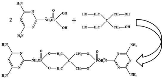 Figure 1 shows FTIR spectra of PER, MP, compound and reactive PER/MP/PP flame retardant masterbatches. It is clearly seen from Figure 1A that several typical vibration peaks of PER are exhibited, such as the stretching vibration of –OH at 3314 cm−1, the stretching vibration of –CH2– at 2955 and 2886 cm−1, the bending vibration of CH2– at 1477 cm−1, and the stretching vibration of C–O at 1016 cm−1. For MP, the following vibration peaks are recognized, such as stretching vibration of –NH2 at 3393 cm−1, stretching vibration of –NH3+ at 3155 cm−1, stretching vibration of C–N at 1671 cm−1, and stretching vibration of P=O at 1108 cm−1. Meanwhile, the characteristic absorption peaks of (P=O)–OH are recognized at 2686 and 961 cm−1. After the reactive extruding, the FTIR spectrum of MP/PER/PP exhibits that the peaks of C–OH at 3369 and 1016 cm−1 of PER and (P=O)–OH at 2686 and 961 cm−1 disappear, and the two new peaks at 1089 and 1045 cm−1 appear, as shown in Figure 1D. This reflects the formation of the phosphoric ester groups (P=O)–O–C [23]. For the compound masterbatches, however, the two new peaks are not observed, and only a peak of P=O at 1108 cm−1 is recognized, which is attributed to MP. The reaction route between PER and MP in extruding can be speculated as shown in Scheme 1 and melamine pyrophosphate (MPP) has been partly generated.