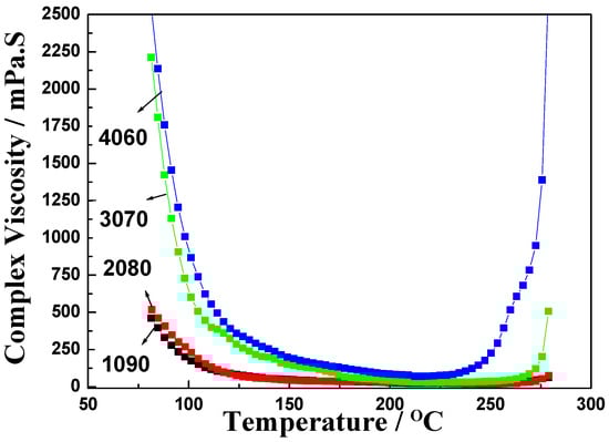 The rheological properties of the 1090, 2080, 3070, and 4060 resin blends were investigated [40,41], and the results are shown in Figure 3. As the temperature increased, their viscosities all first decreased and then reached a steady state before rapidly increasing. The lowest viscosities of the 1090, 2080, 3070, and 4060 resin blends were 17, 25, 32, and 89 mPa·S, respectively. The viscosities of the 1090, 2080, and 3070 resin blends were very low. However, after the content of EPCHPOSS–BPh prepolymer increased to 40%, the viscosities of the blends increased rapidly to 89 mPa·s, respectively. The temperature at which the viscosity started to increase again from a steady state is termed the gel point of the system; that is, the temperature at which the polymer starts to cure. The gel-point temperatures of the 1090, 2080, 3070, and 4060 resin blends were 278, 278, 271, and 243, respectively, demonstrating that the gel-point temperature decreased as the content of the EPCHPOSS–BPh prepolymer increased. By adjusting its viscosity via temperature control, one can make a blend suitable for the molding of carbon-fiber-reinforced composites in the winding and prepreg lay-up processes. Compared to phthalonitrile, the processability of the blends was greatly improved, leading to more extensive applications of the resin matrix.