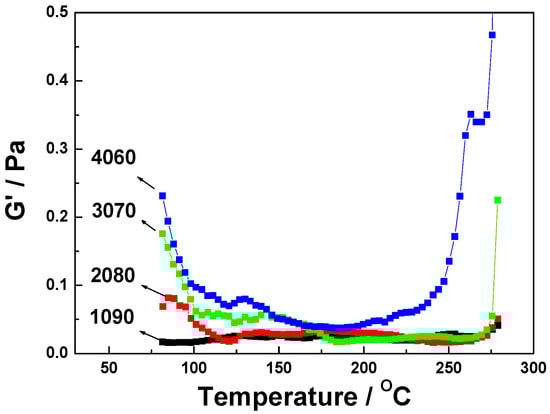 Shear storage modulus (G’) as a function of temperature curves for 1090, 2080, 3070, and 4060 resins.