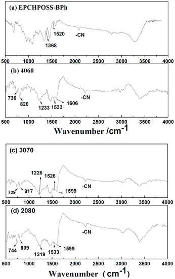 Conclusion 2: The FTIR results indicate that the structures of the 1090, 2080, 3070, and 4060 copolymers were interpenetrating polymer networks with two types of triazine rings. The introduction of POSS tightly linked the network structures of the two types of polymers.