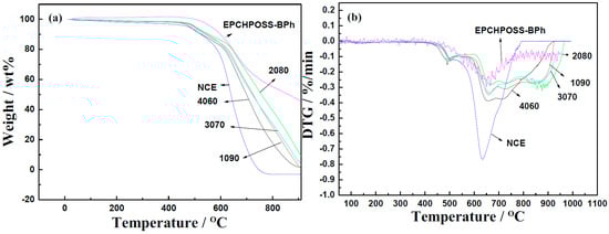 Thermogravimetric analysis (TGA) and Derivative (DTG) plots of NCE, EPCHPOSS–BPh, 1090, 2080, 3070, and 4060 polymers in the air. (a) TG curves and (b) DTG curves.