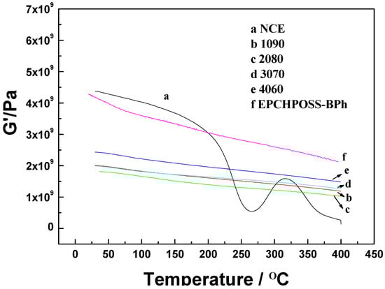 Dynamic storage modulus (G′) as a function of temperature for NCE, EPCHPOSS–BPh, 1090, 2080, 3070, and 4060 polymers under a nitrogenous atmosphere.