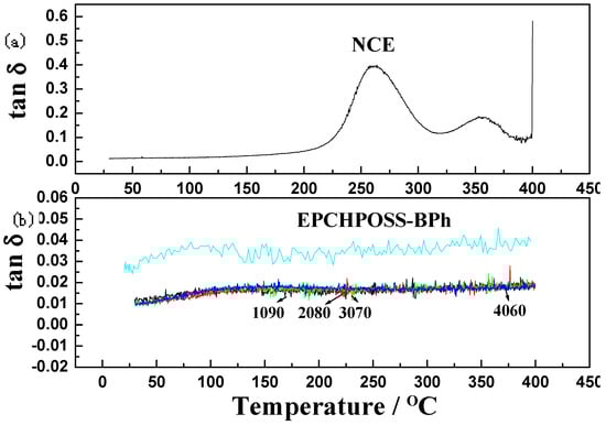 Figure 10 shows that the damping factors (tan δ) of EPCHPOSS–BPh polymer and 1090, 2080, 3070, and 4060 copolymers vary smoothly with increasing temperature without the presence of glass-transition peaks, indicating that all three types of polymers formed a stable three-dimensional network structure that prevented the slippage of chain segments as temperature increased. The absence of glass-transition peaks means that the glass-transition temperature was higher than 400 °C. There are two peaks at 259 and 356 °C. In the curve depicting the variation of the damping factor (tanδ) of NCE resin with temperature, these two peaks correspond to the two fluctuations in the variations of dynamic storage modulus with time in Figure 6. The two peaks are associated with the two phases in the curing process, indicating that the polymer chain of the NCE resin underwent a glass transition starting at 259 °C, resulting in the slippage of chain segments. This slipped further at 356 °C. A thorough comparison shows that the thermal resistance of NCE blends significantly improved, and the glass-transition temperature of the blends was at least 140 °C higher than that of NCE [10,11,36].
