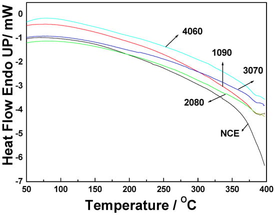 The Tg temperatures were obtained from DMA for NCE, 1090, 2080, 3070, and 4060 polymers. This was included with DSC data in Figure 11. All curves undergo exothermic processes when the temperature is elevated—especially the NCE polymer, which had the highest heat release. Figure 11 shows that 2080 had no obvious Tg temperature (above 400 °C), while the Tg temperatures of NCE, 1090, 3070, and 4060 were 360 °C, 384 °C, 380 °C, and 377 °C. These were different from the DMA results. The cure extent of the polymer and the aged extent [46] at elevated temperatures will affect the Tg temperature obtained from DSC.