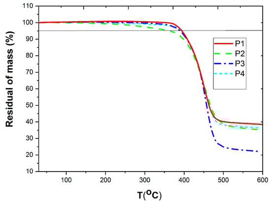 All these polymers show good thermal stability, as revealed by thermogravimetric analysis (TGA) with decomposition temperature over 350 °C. As shown in Figure 1, the onset decomposition temperature (Td) (5% weight loss) was found to be at 387 °C (P1), 368 °C (P2), 385 °C (P3) and 386 °C (P4), respectively. Good thermal stability is helpful for stabilized morphology of the active layer at elevated temperatures.