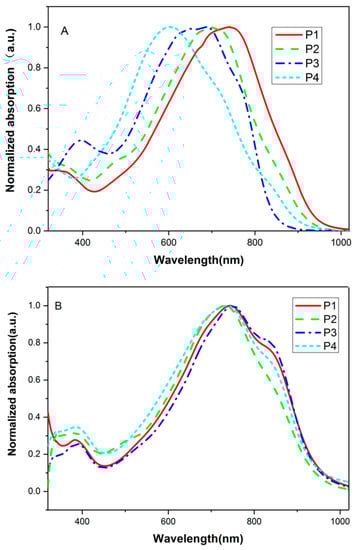 UV-vis spectra of P1, P2, P3 and P4 in dilute chloroform solutions (10−6 mol/L) (A) and films (spin coating from chloroform solutions) (B).