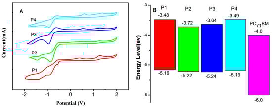 Cyclic voltammetric curves (A) and energy levels (B) of the polymers (estimated by the empirical relationship proposed by de Leeuw et al. []).