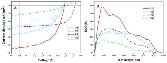External quantum efficiencies (EQEs) were measured for different PSC devices under optimized device conditions (Figure 4B). As shown in Figure 4B, the EQE spectra of the four polymers showed a clear photo-response over the spectral region between 300–900 nm, consistent with the absorption of PC71BM and the polymer. Device based P1 showed the highest photo-response with a maximal EQE in a broad range of 350–900 nm, that benefited from the intensive absorption of polymer P1 in this region. This result is in accordance with the highest Jsc of the corresponding device based P1. In contrast, the device based fluorinated-polymer P2 showed negligible contribution in the absorption of polymer PC71BM, leading to the lowest Jsc. However, the peak positions of EQE spectra were different from the absorption spectra of polymers because the photocurrents were contributed by the PC71BM (300–500 nm) and polymer (500–900 nm) absorption.