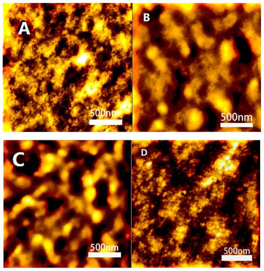 Atomic force microscopy (AFM) topographic images (2 μm × 2 μm) of polymer/PC71BM blend films. P1 (A), P2 (B), P3 (C) and P4 (D).