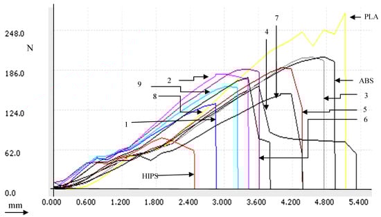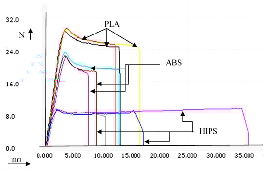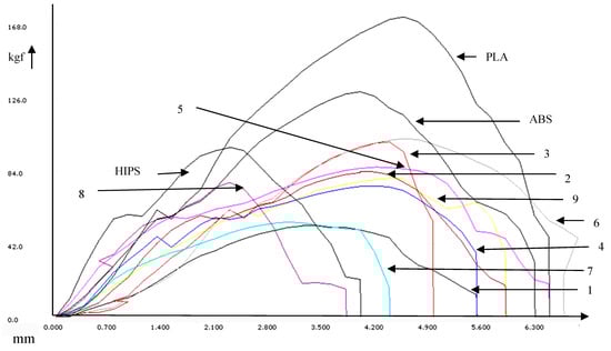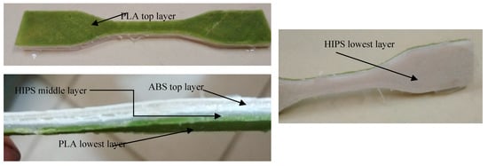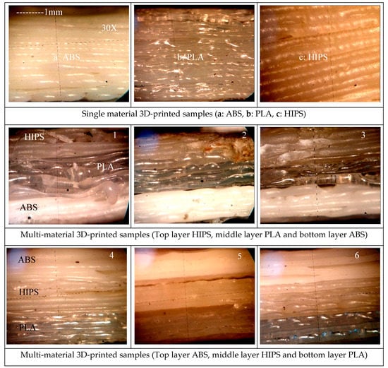As observed from Figure 3, the selected grade of PLA thermoplastic has the greatest peak load value (see Table 1), followed by ABS and HIPS. Hence, in multi-material structures, if PLA is selected for the outermost layer, followed by ABS (middle layer) and HIPS in the innermost section (especially in arch structures), this will lead to better stability from a load-bearing view point. Similar observations have been made by other investigators [36,37,38].