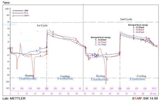 Figure 4 shows the DSC thermographs for ABS, PLA, and HIPS polymers. As observed from Figure 4, ABS, PLA, and HIPS are compatible with each other and have similar ranges of heat integral value. It has been observed that the integral heat input during heating of ABS, PLA, and HIPS was 13.63 mJ, 14.71 mJ, and 11.71 mJ, respectively. Thus, multi-material printing (with proposed combination) may result in better layer connectivity. On the other hand, during solidification of the material, it was observed that ABS, PLA, and HIPS released 13.52 mJ, 10.80 mJ, and 10.87 mJ (which are also in similar range).