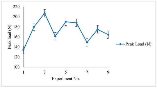 Based upon Table 3, Figure 5 shows a graphical representation of peak load vs. experiment number (error bars with standard error), which is well in 5% range. Similar results have been attained for all other mechanical properties.