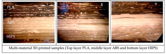 Based upon Table 2, 9 specimens (with three repetitions on each setting) of multi-material components were printed (as per Taguchi L9 orthogonal on commercial FDM setup as per ASTM D 638 type IV). The samples composed of single materials (ABS, PLA, and HIPS) were also printed with fixed parametric settings of FDM to analyze the changes in the mechanical strength and the interconnectivity of layers. Figure 2 shows the 3D-printed parts with multi-material layers.