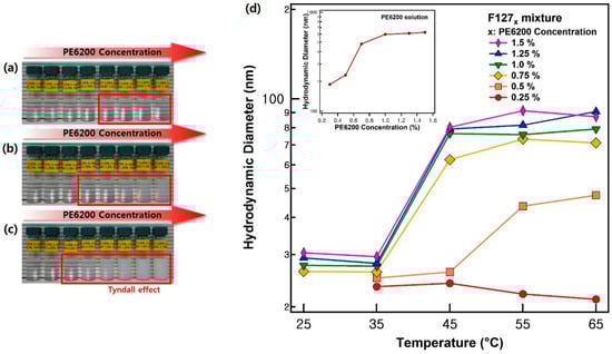 Visual inspection and dynamic light scattering (DLS) data. The figure on the left depicts the results of visual inspection. The temperatures in the figures are (a) 40 °C, (b) 45 °C, and (c) 50 °C. The concentration of PE6200 in each sample increased by 0.25% gradually from left to right. The concentration of PE6200 in the first sample is 0%. In the (d) DLS results, the graph on the right depicts the average size distribution of the micelles.
