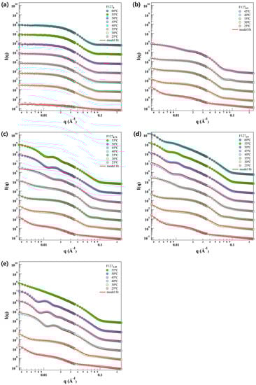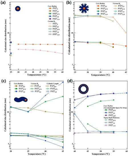 The SANS intensities were reproduced using the model (Figure 2). For F1270 at 25 °C, the SANS intensity was fairly low, which indicates that the F127 block copolymer exists in the form of a random coil in aqueous solution. The radius of gyration of the random coil polymer was obtained from the nonlinear squares model fit with the Gaussian coil model [30]. The size of coil for the Gaussian coil model for F1270 at 25 °C was approximately 5.22 nm. As the temperature increases, the SANS intensity of F1270 is increased as well, resulting in near q−4 behavior at the middle q region and a very flat scattering pattern at the low q region, which is typical for a spherical particle (Figure 2a), through the nonlinear squares model fit with the core-shell spherical form factor [31]. In addition, the intensities of F1270.5 at 30~45 °C, F1270.75 at 30~45 °C, F1271.0 at 30~40 °C, and F1271.25 at 30 °C showed q−1 behavior in low q region, which is typical for a cylinder form. The intensities of F1270.75 at 50~55 °C, F1271.0 at 45~60 °C, and F1271.25 at 40~55 °C showed q−2 behavior in the low q region, which is typical for a vesicular form [39]. However, in F1270.5 at 25~45 °C, F1270.75 at 25~45 °C, F1271.0 at 25~40 °C, and F1271.25 at 25~30 °C, a single model could not reproduce the SANS intensities. In these cases, the phases coexist before and after the transition and are regarded as being in the metastable region during the phase transition. Therefore, the intensities of the metastable region were reproduced by a sum of models, core-shell sphere and core-shell sphere with a different shell thickness, core-shell sphere and vesicle or core-shell sphere and cylinder. The micellar size information is depicted in Figure 3. Sizes were classified with respect to the form of micelles for each temperature, and the changes in them are aggregated in Figure 3a–d. Additionally, Figure 4 presents the transitions of the F127x micelle form. It was revealed that the phase behavior of the F127x micelle proceeds from sphere < cylinder < vesicle, which is a typical trend in polymeric micelle phase transitions [39,40].