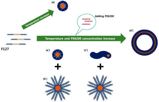 Phase transitions of F127x. (a) The F1270 is transformed into a spherical micelle. However, after adding PE6200, the other F127x samples were transformed into (a’) spherical micelles, (b’) spherical micelles SC, (c’) cylindrical micelles, and (d’) vesicular micelle with temperature increase.
