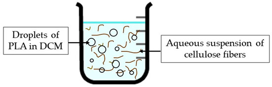 In a typical laboratorial procedure, a suitable amount of PVA was dissolved in 110 mL deionized water containing 0.1 g CTAB and stirred at 300 rpm using a mechanical stirrer (Heidolph RZR 2021, Schwabach, Germany). Separately, 0.5 g cellulose fibers was suspended in 50 mL of deionized water using an IKA® T25 UltraTurrax® homogenizer at 10,000 rpm for 1 min, and after this suspension was added to the PVA solution. After homogenization of the PVA and the cellulose fibers, the solution of 2 g PLA in 40 mL dichloromethane (previously prepared) was poured into the aqueous suspension producing an oil-in-water emulsion (Figure 1). PVA is commonly used in emulsification solvent evaporation formulations as dispersant to prevent the coalescence of the oil droplets, having been observed that the used amount affects the preparation of microspheres [38,39,42]. Since the cellulose pulp has carboxylic groups, a cationic surfactant (CTAB) was used together with PVA to stabilize the emulsion and to promote cellulose incorporation in the PLA. The amount of CTAB was kept constant and PVA concentration was changed in order to evaluate its effect on the process yield. The system was mechanically stirred at constant rate (300 rpm) for 24 h at room temperature (20 °C) to evaporate the organic solvent. The spheres were recovered from the liquid phase by sedimentation, thoroughly washed with deionized water in order to remove the dispersants (PVA and CTAB) and dried at 40 °C for 2 days. An assay without cellulose addition was also carried out using the same procedure, and the PLA spheres were recovered.