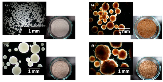 Pictures of some PLA/cellulose biocomposite spheres: (a) PLA/MCC; (b) PLA/MCC-L61; (c) PLA/GUP; (d) PLA/GUP-L61 (see Table 1 for sample identification).