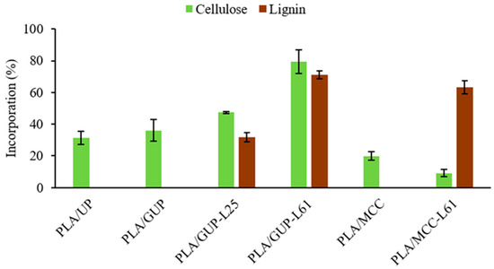 Regarding cellulose fibers incorporation (Figure 3), for the GUP fibers it was observed an increase of cellulose incorporation from 36.0% to 79.4% with the increase of lignin content from 4% to 61%. Moreover, the lignin retention exhibits a similar trend. In other words, the pulp fiber incorporation in the PLA spheres increases from 36% to over 70%, with the increase of the fiber lignin content. For the MCC, the behavior is the opposite; there is a decrease when the cellulose is modified with lignin (Figure 3). This result may be due to desorption of the previously precipitated lignin on the MCC, by preferential dissolution in dichloromethane. On the other hand, the high lignin incorporation (63.1%) in the PLA spheres is a clear indication of the high affinity of the lignin to the PLA (see, also Table 3).