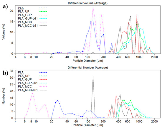 Particle size distributions in volume (a) and in number (b) for some PLA/cellulose biocomposite spheres (see Table 1 for abbreviations).