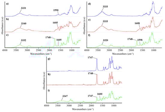 ATR-FTIR spectra of cellulose samples, PLA and biocomposite spheres: (a) UP or GUP; (b) GUP-L61; (c) PLA/UP; (d) MCC; (e) MCC-L61; (f) PLA/GUP-L61; (g) PLA; (h) PLA/MCC; (i) PLA/MCC-L61 (see Table 1 for abbreviations).
