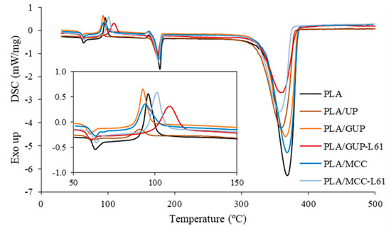 Composite spheres were compression molded into films and these were characterized concerning their thermal, structural and mechanical properties. Thermal properties were investigated via DSC. The DSC curves are depicted in Figure 9 and were used to determine the glass transition temperature (Tg), cold crystallization temperature (Tcc), cold crystallization enthalpy (ΔHcc), melting temperature (Tm), melting enthalpy (ΔHm) and degradation temperature (Td) of the different samples. At the end of the DSC test, the aluminum pans were weighed in order to determine the solid residue at 500 °C. These results are shown in Table 4 along with the degree of crystallinity (Xc). It can be seen that the PLA exhibited a Tg at 62.1 °C and the composite films have a slightly lower Tg, except the PLA/MCC-L61 film (1% cellulose) that presented similar Tg to the PLA. The decrease of the Tg signifies that cellulose incorporation increases the chain mobility of the PLA polymer. It was also observed that the PLA fraction undertaken cold crystallization in the DSC test is composite dependent. For example, the original cellulose fiber (UP) led to the smallest cold crystallization peak (Figure 9), but the film exhibits the highest PLA crystallinity degree (Table 4). This indicates that this composite had favorable conditions to crystallize in the film making process. The contrary occurred for the composite incorporating grinded UP (GUP). Compared with PLA, the cold peaks shifts to lower temperatures for PLA/UP, PLA/GUP and PLA/MCC composites, indicating that cold crystallization occurs earlier induced by UP, GUP and MCC which act as nucleating agents for PLA crystallization, in good agreement with results reported by other authors [26,43,53,54]. On the contrary, the presence of lignin in the cellulose materials (PLA/GUP-L61 and PLA/MCC-L61) led to higher Tcc. This result is in agreement with reported by Gordobil et al. [50] which found that the introduction of lignin in the PLA matrix affects the crystallization behavior causing that the PLA chains have a lower mobility and crystallize with greater difficult and higher temperatures. According to the reported by Graupner [12] and Graupner et al. [32], lignin improves the fiber/matrix adhesion, which may explain the decrease of the mobility of the PLA chains, and consequently hindering the crystallization process leading to composites with lower crystallinity and higher values of Tcc as well. Frone et al. [54] observed a similar behavior in PLA nanocomposites reinforced with silane treated nanofibers.