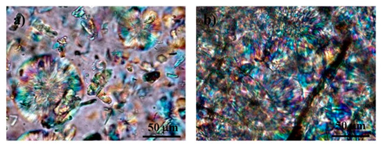 Table 4 shows a substantial increase of the degree of crystallinity of the PLA films with the inclusion of cellulose fibers in its original dimension (from 29.2% to 54.6%). The same fibers, after being ground (GUP), which have much higher fines content, provokes a substantial decrease of the crystallinity of the PLA in the film. The additional inclusion of lignin on the fibers surface causes a huge decrease of the PLA crystallinity from 28.9% to 10.5%, in accordance with the lower mobility of the lignin adsorbed PLA molecules previously commented. The same trend occurs for the MCC, but with lower extent. Figure 10 shows that more and larger spherulites are formed in the PLA/UP biocomposite film than in the PLA/MCC. The higher specific surface area of the MCC (and grinded fibers) provides much higher nucleation points for crystallization, which hypothetically did not provide conditions for appropriate spherulites growing. On the contrary, the reduced number of nucleation points in UP fibers provides conditions for good spherulites growing, which led to very high crystallinity degree.