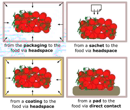 Figure 1. For instance, AM agents can diffuse through the headspace in a non-contact mode or migrate to the food by a direct contact between the packaging material and the food. For some food products, such as fresh meat, in which the microbial contamination occurs primarily at the surface, direct surface application of AM agents has limited benefits, because they rapidly migrate into the food mass. On the other hand, the non-contact and prolonged release of AM agents from packaging, coatings or sachets can help maintain high AM concentrations when needed [
