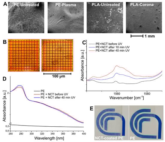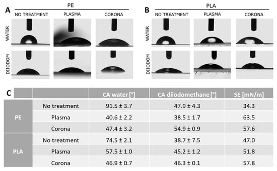 Figure 2C). Depending on the surface treatment applied, a different response was observed for the two analyzed materials. In particular, PE films exhibited higher wettability upon plasma treatment, while in the biodegradable polymer PLA film, corona treatment was more effective. Therefore, plasma-treated PE and corona-treated PLA were selected for further investigation.