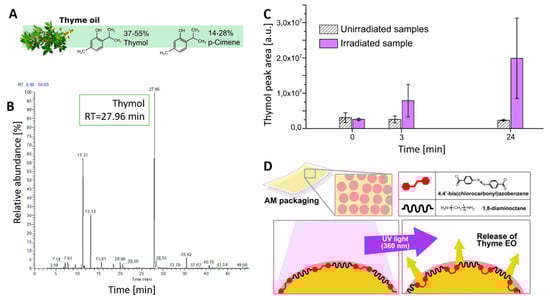 Figure 5B, indicated that the most abundant peak, attributed to thymol, had a retention time of about 28 min. The release of volatile thymol contained in thyme EO was evaluated by GC–MS measurements on NCT-coated PE films. For this purpose, two NCT-coated PE films were placed in two 15 mL quartz testing tubes; one was kept in darkness, while the other was irradiated for 15 min with a UV lamp (360 nm) to trigger the EO release from the photo-responsive NC coating. The headspace of each tube was withdrawn with a gas syringe and analyzed by GC–MS. The results, reported in