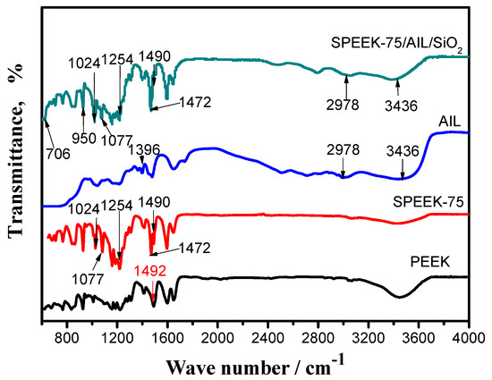 2.2. Characterization of Sulfonated Poly(ether ether ketone)/Ammonium Ionic Liquid/Silicon Dioxide Composite Membrane