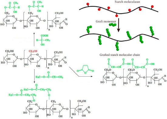 One strategy for modification is the use of hydrophobic groups to replace hydrophilic hydroxy groups on the starch molecule chain [8,9]. To do this, most strategies have focused on the starch acetylating [10] and the grafting of highly reactive hydrophobic functional groups onto the starch polymeric backbone [11,12,13]. The grafted functional groups could react with the hydroxyl groups of starch macromolecules to form covalent bonds, providing better control of phase size and improved interfacial adhesion. Additionally, Sagar [14] believed that modification of starch could increase the length of the starch side chain, which enhanced thermoplastic and hydrophobic characteristics, and that the hydrophobic function group in the starch structure could play the role of plasticization.