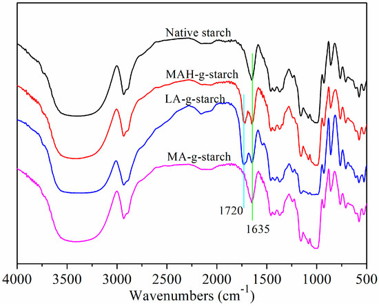 The basic compositional unit of native corn starch is d-anhydroglucose, with C2 and C3-linked secondary hydroxyls as the main characteristic functional groups, a C6-linked primary hydroxyl, and a d-pyranose ring structure [24]. The positions of the absorption peaks in the infrared spectrum for these main structures are shown in Figure 2: the characteristic peak centered at 3310 cm−1 corresponds to O‒H stretching and vibration of the hydrogen bond association, 2930 cm−1 corresponds to C‒H asymmetrical stretching and vibration, 1635 cm−1 arises from the water that is tightly bound to the starch, 1152 cm−1 is from C‒O‒C asymmetrical stretching and vibration, 1080 cm−1 corresponds to d-glucopyranose and hydroxyl-linked C‒O stretching and vibration, and 925 cm−1 is due to glucosidic bond vibration [25]. The infrared spectra for the grafted starches include all of the above characteristic absorption peaks, but also a C=O absorption peak at 1720 cm−1 [26,27]. Following the reaction of the starch with hydrophobic monomers, the unreacted hydrophobic monomers and homopolymer were removed by the acetone wash. It could be confirmed that the C=O came from grafted starches according to the positions that appeared, which verified that the graft reaction had occurred between the native starch and grafting monomer.