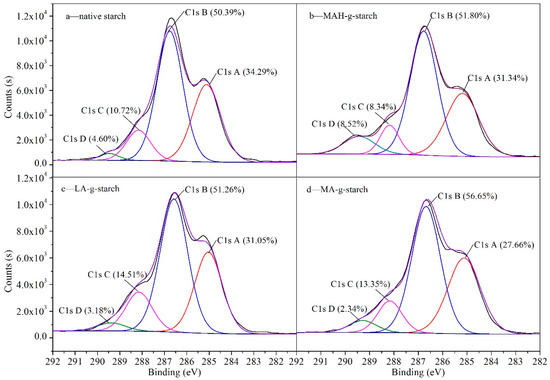 To further validate that the grafting reaction had occurred, the samples were subjected to X-ray photoelectron spectroscopy (XPS) to establish the binding modes of C in the samples; the results are shown in Figure 3 and Table 1. Compared with native starch, the relative concentration of C-containing groups with a binding energy between 284.9 and 289.0 eV was significantly different in the grafted starch samples. Comparing the XPS spectrum of native starch (Figure 3a) to the spectra of MAH-g-starch (Figure 3b), LA-g-starch (Figure 3c), and MA-g-starch (Figure 3d) shows that the intensity of the peak at 284.9 eV was decreased, which was attributed to the presence of more C‒C/C‒H groups. At the same time, the intensity of the peak at 286.1 eV was decreased, which represented the presence of C‒O groups. From the results in Figure 3, we see that the amount of C‒O in the grafted starches was higher than that in the native starch, which was attributed to the high incidence of grafted molecular chains in the grafted starch material. The intensity of the 287.6 eV peak was also changed, which reflected the presence of C‒C=O groups. In addition, the intensity of the 289.0 eV peak for the modified starch was changed, which was attributed to the abundance of O=C‒O groups. The chemical environmental changes indicated that the corn starch had reacted with the hydrophobic monomer through in situ solid phase polymerization, in which the C‒O(H) bond was broken and carbonyl groups (C=O) were generated. The results of the relative content of each chemical structure indicated that there was a difference in the content of C=O in the three kinds of grafted starches. The content of C=O in native starch was 15.32%; after the treatment, the C=O content increased to 16.86% in MAH-g-starch, 17.69% for LA-g-starch, and 15.69% for MA-g-starch. This difference in the three treated starches may be due to different reaction efficiencies, resulting in differences in the grafting ratio. To verify these differences, the grafting ratio was tested for the three kinds of graft starches.