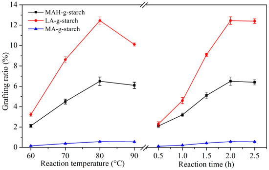 The effects of reaction temperature and reaction time on the grafting ratio of three kinds of grafted starches were discussed. The results are shown in Figure 4. With the increase in reaction temperature, the grafting ratio of three kinds of grafted starches all increased gradually, and reached the maximum at 80 °C. However, when the reaction temperature was higher than 80 °C, the grafting ratio began to decrease. The temperature was too high; the molten monomers evaporate into the reaction vessel in the form of vapor. As the distance between monomers’ gasification and starch increased, the collision probability decreased, and the reaction efficiency also decreased. In addition, when the temperature was too high, the possibility of the homogenization of monomers increased, resulting in a decrease in the amount of monomers and a decrease in the grafting ratio. The reaction time was too short and the grafting reaction between monomers and starch was incomplete. At this time, the grafting ratio of three kinds of grafted starches was lower. When the reaction time was extended from 0.5 to 2.0 h, the grafting ratio gradually increased. However, when the reaction time exceeded 2.0 h, the grafting ratio had basically stabilized. This was due to the fact that the graft copolymerization of starch with monomers tends to be saturated.