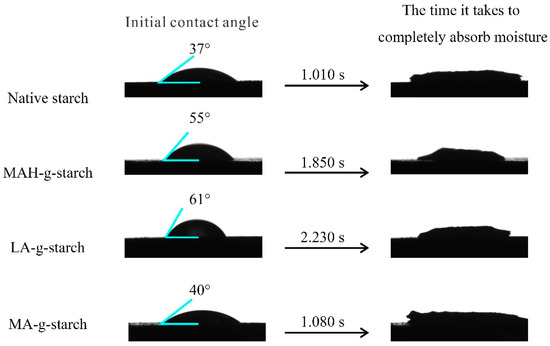 The molecular chain of the native starch contains many hydrophilic hydroxyl groups, and the grafting of hydrophobic groups onto the native starch would improve the relative hydrophobicity of the starch. The contact angle (CA) of water on a surface is the angle formed by a tangent line from the water droplet to the solid surface, and is an indication of the relative hydrophobicity of the sample surface. Generally speaking, the larger the CA, the higher the water resistance of the material [28]. The surface contact angles of the native starch and the modified starches were measured with a contact angle tester to determine the relative hydrophobicity, and the results are shown in Figure 5. As shown by the data presented in Figure 5, the initial contact angle of the native starch was only 37° and full absorption of water droplets required only 1.010 s. After the modification of in situ solid phase polymerization, the initial contact angle was increased and the absorption time of water droplets was prolonged for all grafted starches. The results suggested better relative hydrophobicity of the grafted starches compared to native starch, due to the replacement of the hydrophilic hydroxyl groups on the bamboo fiber with hydrophobic carbonyl groups. The contact angle and the time of full absorption varied for the three kinds of grafted starches. The LA-g-starch had the largest contact angle and the longest absorption time and the MA-g-starch had the smallest contact angle and the shortest absorption time, indicating that the relative hydrophobicity of LA-g-starch was the best and that of MA-g-starch was the worst. The relative hydrophobicity of the grafted starches was directly related to the number of hydrophobic groups grafted into the starch, and more hydrophobic groups resulted in better relative hydrophobicity. Thus, the measured contact angles were consistent with the grafting ratios.