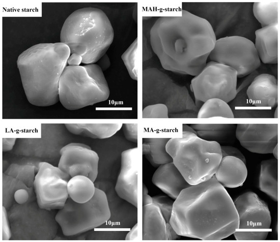 Figure 6 shows the SEM micrographs of the grafted starch, where it can be seen that the native starch granules were solid circles with smooth surface and edges. Comparison with the native starch, the in situ solid phase polymerization did not destroy the granule structure of the starch. This may be because solid phase reaction process was conducted under anhydrous conditions, and there was no starch gelatinization. There were morphological changes in the grafted starches, as the surface became rough and the granule surface was destroyed. This was because the graft polymer was grown on the starch granules, and the granules were bonded together. However, there was no obvious change in granule size, indicating that in situ solid phase polymerization mainly occurred on the surface of the starch granule. The SEM micrographs showed that the surface roughness and bond degree of MAH-g-starch and LA-g-starch were more obvious, especially for the LA-g-starch. The results indicate that the surface roughness of the grafted starch was positively correlated with the grafting ratio.