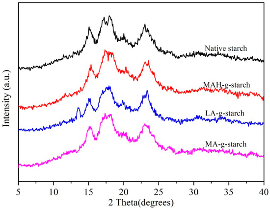 The XRD diffraction peaks for native starch were typical of an A-type crystalline structure, with 2θ values of 15°, 17°, 18°, and 23° [29]. After the grafting reaction, the crystallization type of grafted starches did not change, suggesting that the reaction mainly occurred in the amorphous areas of the starch. The intensity of the XRD diffraction peaks in the hydrophobically modified starch was clearly weaker compared to those of the native starch. According to the report [30], it can be calculated that the degree of crystallinity of native starch was 27.93%, and after modification, the crystallinity of the grafted starches was reduced to varying degrees. This suggested that in situ solid phase polymerization could destroy the crystalline structure of starch to some extent. In other words, the hydrogen bonds between molecules were weakened, thus the thermoplasticity of grafted starches increased [31]. This phenomenon was due to infiltration of the hydrophobic monomers into the crystalline area to destroy the hydrogen bonding between the molecules in this region. At the same time, the hydroxyl groups on the starch chain reacted with the hydrophobic monomers, and the molecular chains gradually grew and crosslinked, which further destroyed the crystallinity of the starch. The decrease in the crystallinity of the grafted starches varied, as the MAH-g-starch decreased to 23.47%, LA-g-starch decreased to 22.29%, and MA-g-starch decreased to 24.69%. The grafting ratio of LA-g-starch was the highest and more hydroxyl groups on the chain of starch reacted, with the most serious destruction of hydrogen bonds. The grafting ratio of MA-g-starch was the lowest and the destruction of its crystalline structure was the smallest. More graft polymer molecular chains attached to the starch molecular chain resulted in a more loose structure.