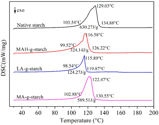 DSC is a common method for researching melting properties [32]. The starch melting can also be used to characterize the degree of difficulty for starch plasticization. By comparing the DSC endothermic peak area, the change of melting enthalpy after grafting modification by different monomers. The degree of gelatinization of native starch, MAH-g-starch, LA-g-starch and MA-g-starch were tested by DSC, and the results are presented in Figure 9. The thermal transitions temperature of the samples were defined as To (onset), Tp (peak) and Tc (conclusion), and the enthalpy of melting was referred to as ΔH.