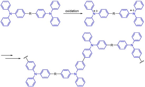 Drop casting, spin coating, self-assembly [], and electropolymerization are representative methods to prepare thin films of functional materials []. Among them, electropolymerization stands out as a convenient method to achieve polymer formation and film deposition simultaneously. This decreases the experimental time and cost and partially solves the solubility problem of some compounds. A large number of electropolymerized films have been prepared from monomers functionalized with thiophene or carbazole derivatives [,,,,,,]. In addition, triphenylamine groups have been used as polymerizable units to prepare thin films of organic and metal complexes by electropolymerization [,,,]. Triphenylamine can be electrochemically oxidized into aminium cation radical, which acts as the key intermediate to form polymeric structures connected by tetraphenylbenzidine bridges (Figure 1) [,,,]. Interestingly, these newly-generated tetraphenylbenzidine units are electroactive and show strong NIR absorptions as a result of the intervalence charge transfer (IVCT) transitions in the mixed-valent state [,,]. However, the use of this property in NIR electrochromism has not been fully exploited.