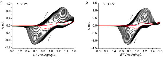 Cyclic voltammograms (CVs) recorded during the oxidative electropolymerization of (a) 1 and (b) 2 on an indium–tin-oxide (ITO) glass electrode by 20 repeated potential scan cycles between 0 and +1.6 V at 100 mV/s. The plots in red color are the first cyclic scan.