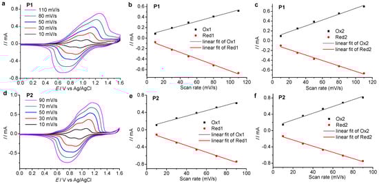 CVs obtained at different scan rates of (a) P1 (10, 30, 50, 80, and 110 mV/s, respectively) and (d) P2 (10, 30, 50, 70, and 90 mV/s, respectively). Linear dependence of peak currents of (b,e) the first redox wave and (c,f) the second redox wave of (b,c) P1 and (e,f) P2 as a function of scan rate. Ox1, Red1, Ox2, Red2 stand for the first oxidation, first reduction, second oxidation, and second reduction peak, respectively. The R2 values are over 0.98 for all linear fit. The polymeric films on ITO glass electrode were used as the working electrode.
