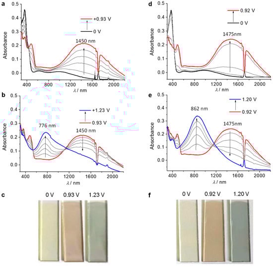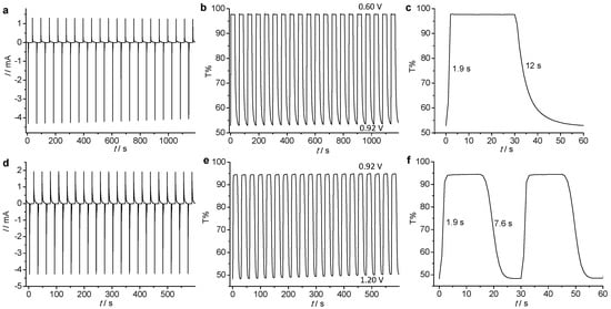 Electrochromic switching of P2 between (a–c) +0.60 and +0.92 V vs. Ag/AgCl and (d–f) between +0.92 and +1.20 V in 0.1 M nBu4NClO4/ClCH2CH2Cl. (a,d) Current assumption. (b,c) Transmittance changes monitored at 1475 nm. (e,f) Transmittance changes monitored at 862 nm.