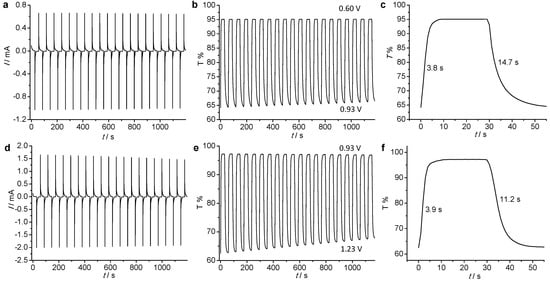 Electrochromic switching of P1 between (a–c) +0.60 and +0.93 V vs. Ag/AgCl and (d–f) between +0.93 and +1.23 V in 0.1 M nBu4NClO4/ClCH2CH2Cl. (a,d) Current assumption. (b,c) Transmittance changes monitored at 1450 nm. (e,f) Transmittance changes monitored at 776 nm.