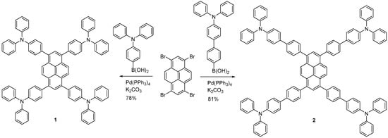 Compounds 1 and 2 were synthesized in good yield by the Suzuki coupling reaction of 1,3,6,8-tetrabromopyrene with 4-(diphenylamino)phenylboronic acid or 4′-diphenylamino-1,1′-biphen-4-ylboronic acid (Scheme 1). These two compounds had a rather low solubility and precipitated out from the reaction mixture when the reaction was complete. A simple filtration procedure led to the isolation of the product, which was used as the monomer for the following electropolymerization experiments. The characterization data of these monomers are described in detail in the Supplementary Materials.