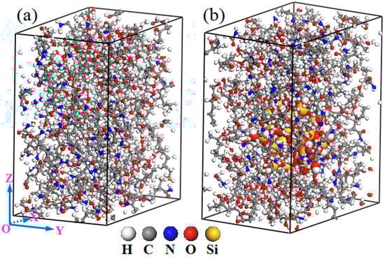 An appropriate molecular chain length in polymers is critically important to the model development, which determines the rationality of the models and the accuracy of the calculation results. In this research, a PVA molecular chain with 50 repeat units and a PAM molecular chain with 31 repeat units were constructed as per our previous studies [17,18]. Following, according to the crystal structure of a-quartz (space group P3321) adopted from the Cambridge Structural Database, a spherical silica nanoparticle with a radius of 6 Å was constructed. The unsaturated boundary effect was avoided by adding hydrogen atoms to the unsaturated oxygen atoms and the silicon atoms of the silica particle surface. Finally, to investigate the effects of nanosilica particles on the properties of the PVA/PAM blend composite, here, two orthorhombic molecular models of pure PVA/PAM blend polymer matrix (component ratio is 50:50) and PVA/PAM/nanosilica composite (component ratio is 46:46:8) were constructed. Their final equilibrium models with same a and b parameters in sizes of 31.53 × 20.06 × 35.62 Å and 31.53 × 20.06 × 36.75 Å are shown in Figure 1. For the molecular model of the pure PVA/PAM composite (Figure 1a), it only contains four PVA molecular chains and four PAM molecular chains; the final density is 1.32 g/cm3. For the molecular model of the PVA/PAM/nanosilica composite (Figure 1b), it also contains four PVA molecular chains and four PAM molecular chains. Furthermore, to prevent any finite size effect of nanocomposites and account for any particle effect at the bulk level, only one nanosilica nanoparticle was embedded at the center of the blend unit cell, and the periodic boundary condition was used. The incorporation of silica results in a final density of the PVA/PAM/silica composite of 1.40 g/cm3. Notice that all of the models in this research were constructed by employing the Materials Studio software (Accelrys Inc., San Diego, CA, USA) [19].