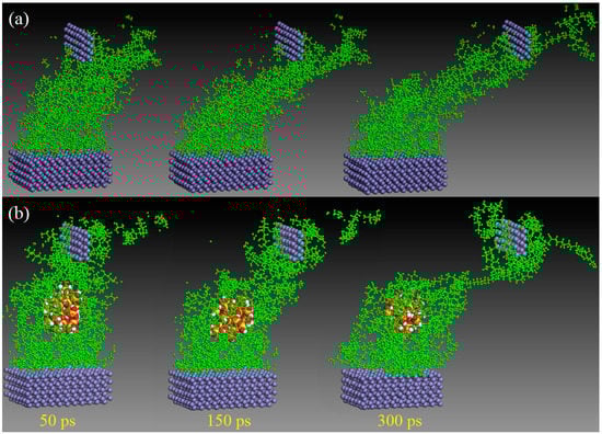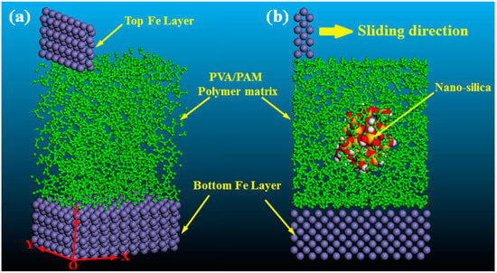 Molecular models of the friction models: (a) pure PVA/PAM polymer matrix; (b) PVA/PAM/nanosilica composites. In the models, the green denotes the polymer (PVA and PAM), the purple presents the iron, and the spherical particle denotes the nanosilica particle.
