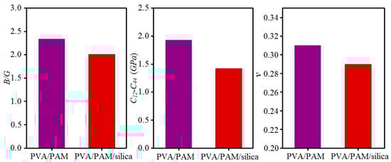 Furthermore, to further evaluate the effects of nanosilica on the ductile and brittle properties of composites, here, the bulk modulus to shear modulus ratio (B/G), Cauchy pressure parameter ratio (C12–C44), and the Poisson’s ratio (v) were also calculated, which are shown in Figure 3. Cauchy pressure is often used to evaluate the ductility of a material; a more positive Cauchy pressure corresponds to a better ductility [33]. The results in Figure 3 show that the introduction of nanosilica decreases the Cauchy pressure value of pure PVA/PAM, but both the Cauchy pressure values are positive, suggesting that the PVA/PAM/silica composite generally has a good ductility, although it is less than that of pure PVA/PAM, and the incorporation of nanosilica weakens the ductility of the pure PVA/PAM composite. The ratio of the bulk modulus to shear modulus can also predict the brittle and ductile behavior of a material [34]. A high B/G ratio is associated with ductility, whereas a low value corresponds to a brittle nature. The critical value that separates ductile and brittle materials is around 1.75 [31]. The B/G ratio values in Figure 3 indicate that adding nanosilica into the PVA/PAM composite decreases the value of the B/G ratio; however, both of the B/G ratios for the two composites are larger than 1.75, demonstrating that both of them are ductile, and nanosilica weakens the ductility to a certain extent. This conclusion shows a good agreement with the Cauchy pressure results. Besides, the Poisson’s ratio of a material can also reflect the resistance ability to deformation [30], and its value is always within the range of −1 to 0.5. The smaller Poisson’s ratio leads to the material having more brittle behavior, which is consistent with the Cauchy pressure and B/G ratio. Therefore, the ductility of the composite could be weakened to a certain extent by incorporating nanosilica into pure PVA/PAM.