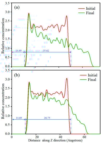 Relative concentration distributions of polymer molecules along the Z direction for (a) the pure PVA/PAM and (b) PVA/PAM/silica composites in the initial (0 ps) and final (300 ps) moments of the friction models.