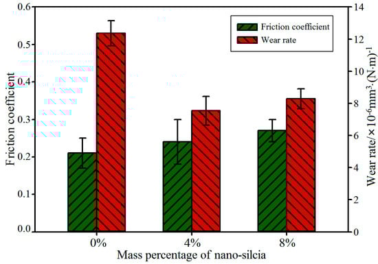 where stands for the wear quality of the membrane samples, represents the density, N is the payload, and L is the sliding friction distance. Each test was repeated three times, and the average value was calculated as the last volume wear rate; these results are shown in Figure 6.